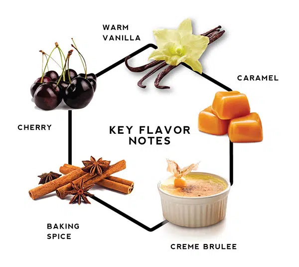 Rich Caramel, Crème brûlée, Vanilla, Hints of cherry, Marzipan, Mild baking spice, Medium round sweet, soft finish