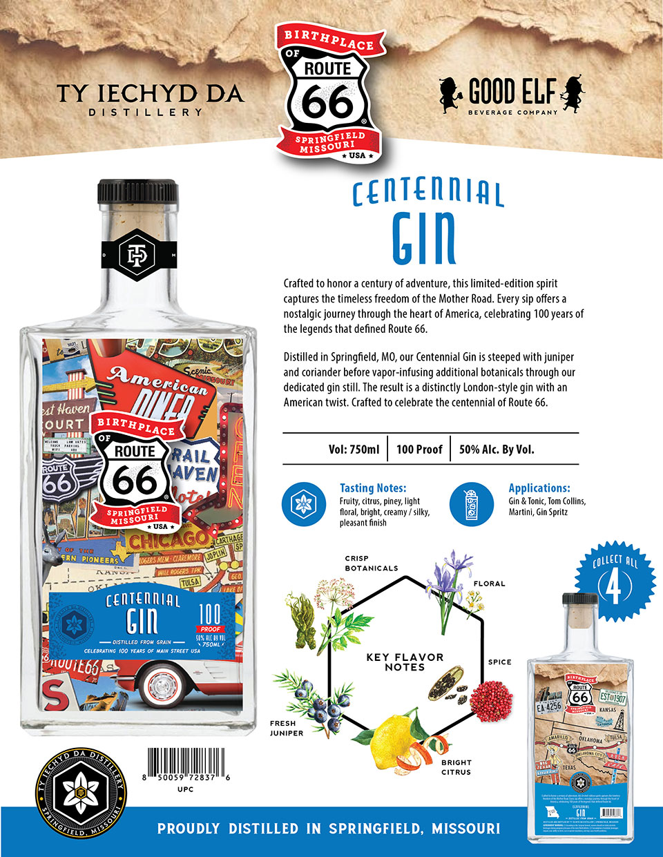 Distilled in Springfield, MO, our Centennial Gin is steeped with juniper and coriander before vapor-infusing additional botanicals through our dedicated gin still. The result is a distinctly London-style gin with an American twist. Crafted to celebrate the centennial of Route 66.
