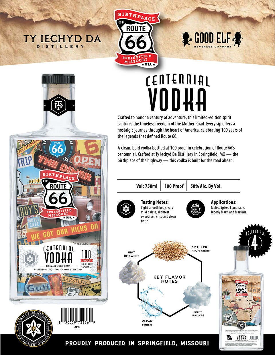 A clean, bold vodka bottled at 100 proof in celebration of Route 66’s centennial. Crafted at Ty Iechyd Da Distillery in Springfield, MO — the birthplace of the highway — this vodka is built for the road ahead.