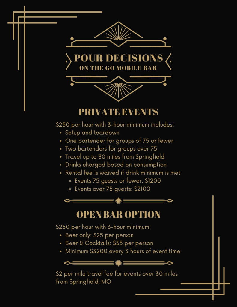 Bring the bar to you with Pour Decisions, our new on-the-go mobile bar designed to elevate any event. Whether you’re hosting a wedding, birthday celebration, block party, or backyard barbecue, we deliver a seamless, on-site beverage experience your guests won’t forget. Featuring local craft beer and handcrafted cocktails brewed right here in the Ozarks, Pour Decisions is the perfect addition to any gathering.